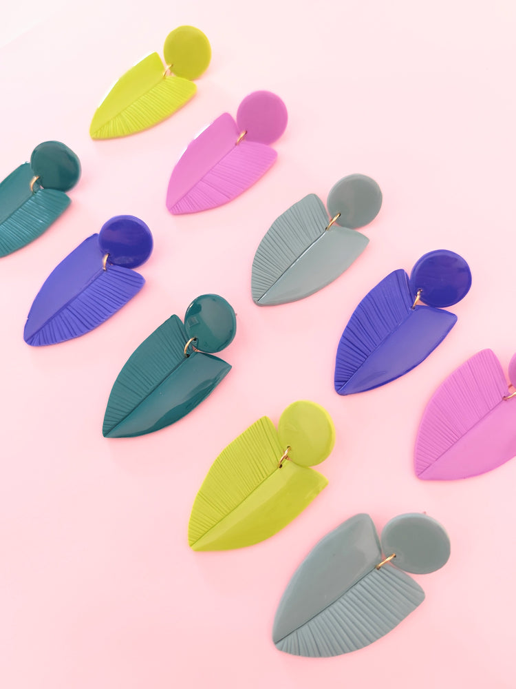 Paraíso es una colección inspirada en la exótica planta Pájaro del Paraíso, especialmente en la forma de sus hojas: grandes, elegantes y con mucho carácter. Cada pendiente está modelado a mano en nuestro taller, con arcilla polimérica de alta calidad, texturas cuidadas y colores vibrantes que evocan la frescura de un jardín tropical.