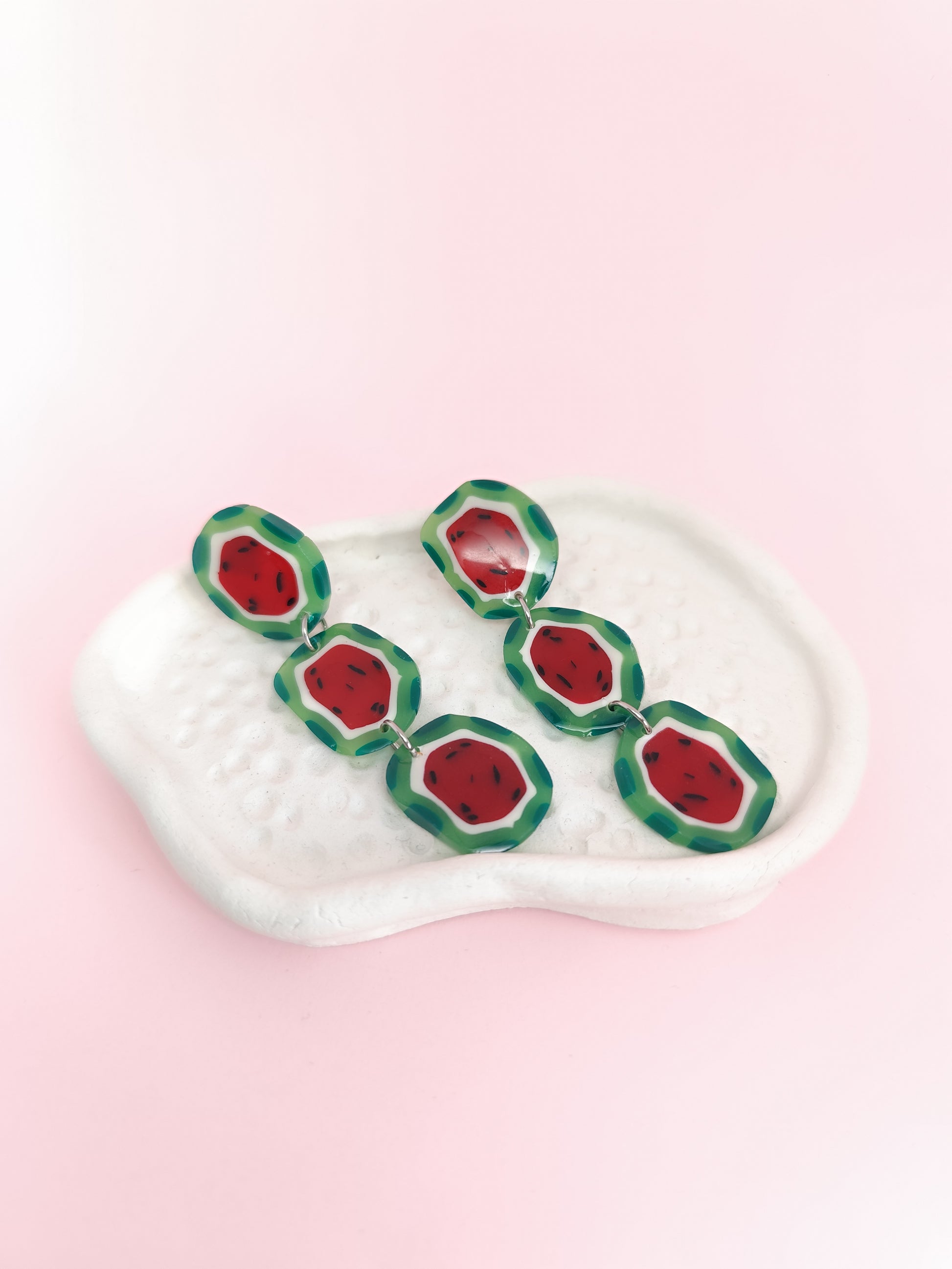 Sandía Party es pura diversión: pendientes largos formados por rodajas de sandía unidas, llenas de color y movimiento. Cada pieza está hecha a mano en nuestro taller con arcilla polimérica, una a una, para que lleves contigo toda la alegría y frescura de un día de verano.
