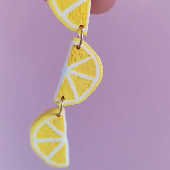 Cascada de Limones es nuestro diseño más llamativo: tres medias rodajas de limón que caen en cascada, llenas de color y movimiento. Hechos a mano en nuestro taller con arcilla polimérica de alta calidad, pieza a pieza, para crear pendientes ligeros, divertidos y únicos.