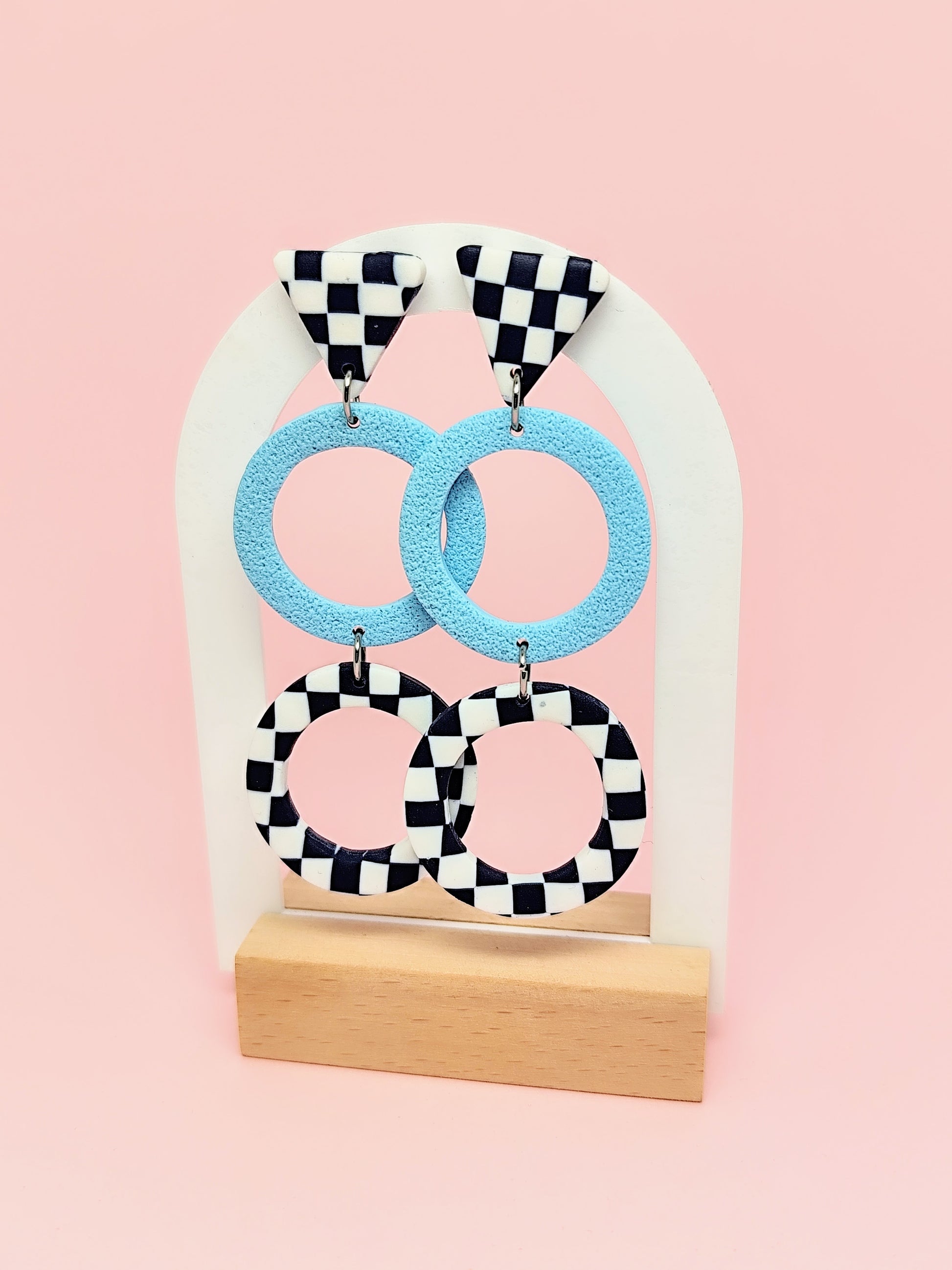 Este par lo tiene todo: original, cañero y fácil de combinar. El triángulo ajedrezado arriba ya llama la atención, pero lo que viene después... ¡doble aro, doble efecto wow! Uno en azul cielo con textura y otro que remata el look con ese rollo gráfico que nos encanta.